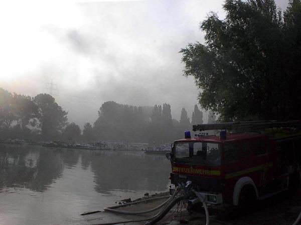 Einsatz von Wasserwerfern an der Nordseite Zur Speisung des Werfers und mehrerer Strahlrohre werden zwei weitere Fahrzeuge des Löschzuges eingesetzt. Die Löschwasserversorgung hierfür erfolgt ebenfalls vom Yachthafen aus durch Kräfte des THW und der Feuerwehr Duisburg. Die Versorgung der Einsatzkräfte während des stundenlangen Einsatzes wird vom Verpflegungstrupp der FF Uerdingen übernommen. Gegen 9:00 Uhr morgens werden die letzten Einsatzkräfte der FF Uerdingen durch Personal der FF Fischeln abgelöst. Zu diesem Zeitpunkt ist das Einsatzende noch in weiter Ferne. Es wird geschätzt, dass der Einsatz noch mindestens weitere 24 Stunden andauern wird. Der LZ Uerdingen ist für 9 Stunden mit bis zu 15 Einsatzkräften beteiligt. Eingesetzt werden LF8/6, jeweils zwei LF 16-TS und MTW sowie der GW-N. |
